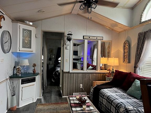 This is NOT a vacant lot. Welcome to camper living! This lot is located within the sought after private Woodsmoke Ranch Campground (RV) Community. Look no further! This extremely well maintained and well decorated park model is "THE ONE". This beautiful lot displays a well manicured lawn. Like to entertain outside? Well you have plenty of space as this lit has a 3 level deck! The 2nd level features a built-in fire-pit and shed with electricity (electric lawnmower included). The 3rd level deck backs up to the ravine. The 2nd and 3rd level are extremely private and cannot be seen from the road. 2 patio sets and a LP gas flat top grill are included. From the new asphalt 4 car driveway you can head up to the park model along the new decorative stone walkway. For even more living space there is an attached screen room with indoor/ outdoor carpeting equipped with sofa recliner, end tables, lamps, portable electric fireplace and bamboo shades. New metal roof installed 2 years ago. Summer of 2023 there was a new central air motor installed. Now let's talk about the inside of the park model! From top to bottom this model has been updated with new floors, lighting, ceiling fans, double sink and faucet in the kitchen, 2 year new fridge, and like new microwave. The pub table and chairs in the kitchen stay. The living room right off the kitchen has a custom day bed that stays. All window treatments stay. The shared bath with the bedroom has new flooring and skylight. The bedroom has a new mattress, large sliding glass mirror doors closet with drawers underneath for additional storage, as well as a built in dresser. Lamps and tables included. HOA dues (2656.15 per year) includes garbage, water and electricity. Woodsmoke Ranch amenities: 2 pools, 2 stocked fishing ponds, 3 pavilions, basketball courts, sand volleyball, gaga ball, bags,2 playgrounds, RC car racetrack, baseball field, laundromat, convenience store, cafe, horse stables (for rent), adult lounge, Mygrain Saloon, events planned year long and so much more. Gated community; showings by appointment only.