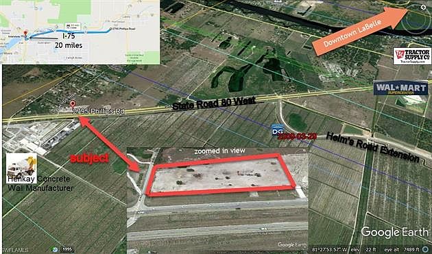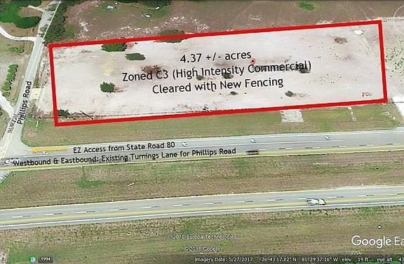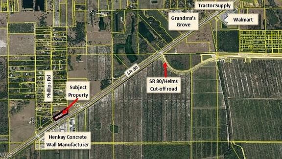 "Ready-to-go" corner at State Road 80 and Phillips Road, with 630+/- feet on SR 80 West. Competitively priced at $1.57/sq ft and adjacent to what's happening! Henkay Concrete Wall Manufacturer, Walmart, Tractor Supply, Grandma's Grove RV Park, new SR 80/Helms Road Extension and More. Current owner has done the hard work--rezoning, clearing, and fencing--now it's ready for action! Property is ideal for practically any type of business and is right in the path of growth between Lee and Hendry Counties. (Property does not require flood insurance.)