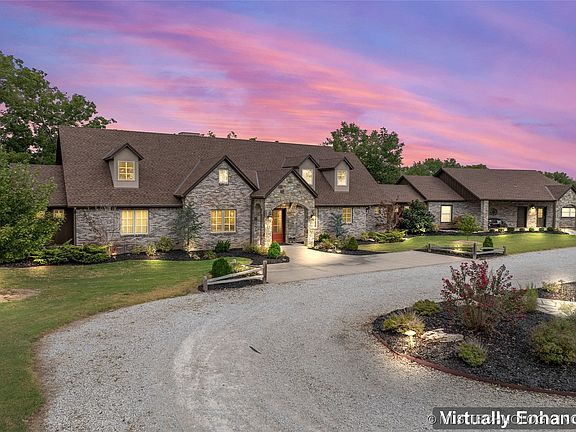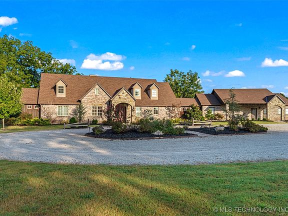 Large gated on over 6 acres that features 2 stocked ponds , gun range, Large Metal Shop, outdoor pool, 50 amp motorhome hookup. Animals approved. The Home has 4 large bedrooms, 3 full & 2 half bathrooms with a bonus bedroom off the garage and another bonus room that could be used as 6th bed/storage/hobby room. This home boasts a large living room & a separate dining room, both with beautiful wood beams & fireplaces along with a beautiful theater room with all the equipment and a stocked bar area perfect for entertaining. Home also has an indoor safe room, a workout room with mirrored walls, a separate office/hobby room, permanent outdoor lighting (for Christmas as well) & storage galore! The attached guest house can be used as a bar or gathering space or a mother-in-law suit as it has 1 bedroom, 1 bathroom, with a full kitchen, living space, laundry room & has private access to the driveway, backyard with pool. Less than 30 minutes to downtown Tulsa or Broken Arrow. OWNER FINANCING AVAILABLE - OWNER IS A LICENSED BROKER IN OKLAHOMA