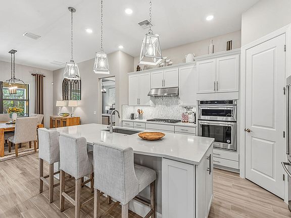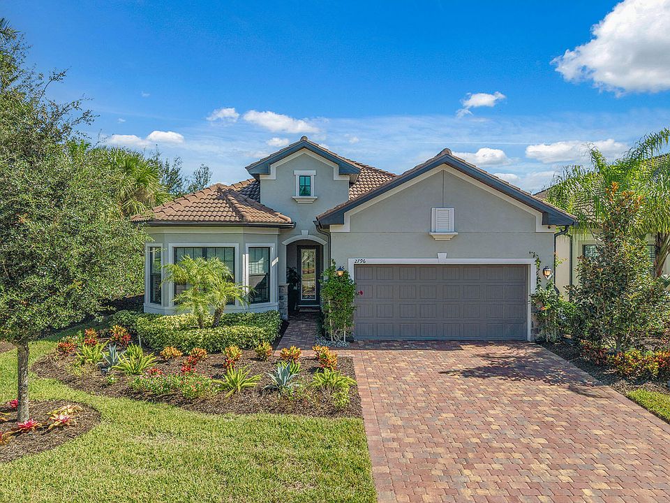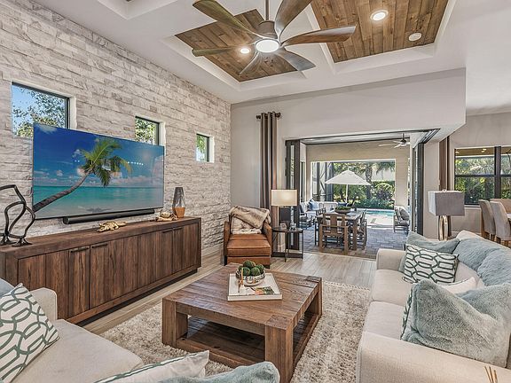 Experience luxury living in this beautifully furnished 2022 residence in Amaranda at Fiddler's Creek, featuring an open floor plan and set on a desirable corner lot framed by private, lush tropical garden views. Designed to look and feel like a model home, this pristine three-bedroom plus den, three-bath retreat showcases an array of custom upgrades, modern finishes, and an effortless indoor-outdoor lifestyle.The exterior is surrounded by mature tropical palms and features a wide brick paver driveway, while full impact-resistant windows and sliders offer peace of mind year-round. A newer HVAC system adds comfort and efficiency. The expansive screened lanai with picture-window screening creates a seamless connection to the outdoors, complemented by a covered living area with ceiling fans and a stunning tongue-and-groove wood ceiling. A fully equipped summer kitchen with gas grill, hood, ceiling-height backsplash, sink, and mini fridge enhances outdoor entertaining, along with a built-in entertainment center featuring floor-to-ceiling tile and a fireplace. The heated pool and spa with waterfall feature and sun shelf are enveloped by lush landscaping, creating a private resort-inspired sanctuary. Inside, elegant tile flooring, recessed lighting, custom ceilings, and designer window treatments elevate every space. The chef's kitchen impresses with white cabinetry, quartz countertops, a mosaic tile backsplash, a pendant-lit island with bar seating, and a spacious walk-in pantry with custom shelving. Newer premium KitchenAid stainless steel appliances include a five-burner gas range with hood, built-in microwave, wall oven, dishwasher, and French-door refrigerator. The kitchen flows into the formal dining area, framed by windows that highlight serene garden views, while the great room showcases a dramatic stacked-stone feature wall, coffered ceilings, and zero-corner sliding doors that fully open to the lanai. The owner's suite is a luxurious haven with tray ceilings, custom lighting, and pocket doors leading to a spa-inspired bath featuring a quartz dual-sink vanity with full-width mirror, an expansive walk-in shower with bench, niche, floor-to-ceiling tile, and multiple showerheads, along with a walk-in closet outfitted with custom built-ins. Two generous guest suites offer comfort and privacy, each with its own en-suite bath featuring a tub-shower combo with glass enclosure. A private den with French doors and a modern fan serves perfectly as an office or study. Additional highlights include a well-designed laundry room with built-in cabinetry and Whirlpool washer and dryer, plus an exceptional garage with epoxy flooring, extensive cabinetry, a large counter workspace, and a tile backsplash. Residents enjoy a renovated 54,000-square-foot Club & Spa, resort pools, dining, fitness, and racquet sports, with optional golf, beach, and boating. Minutes from Marco Island and downtown Naples, the location offers true resort-style living.