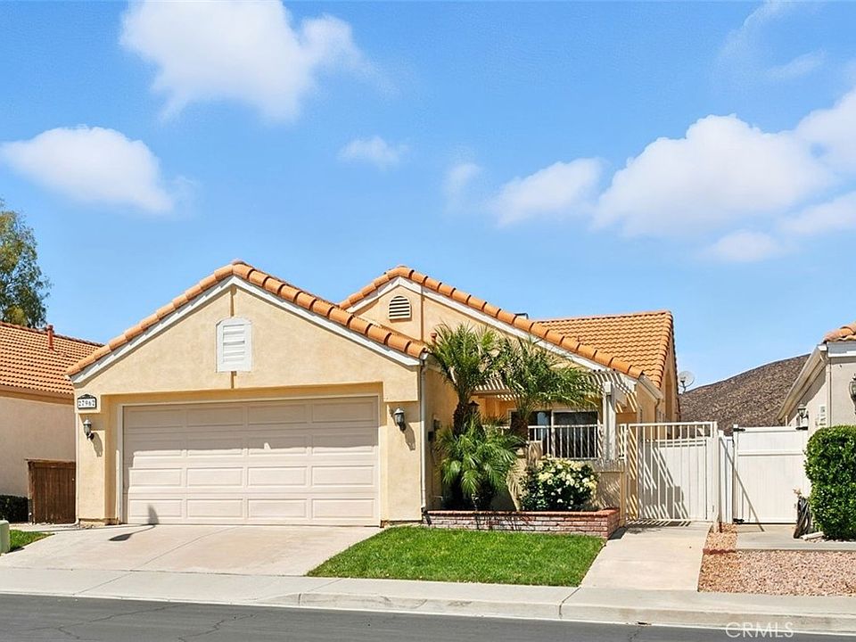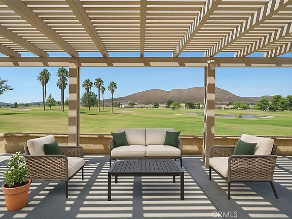 Discover this beautifully situated one-story GOLF COURSE HOME offering 2 bedrooms plus a den, 2 bathrooms, approximately 1,299 square feet, a 2-car attached garage, and stunning panoramic golf course views! Perfectly located in the highly desirable 55+ active Palmilla community, this home places you near endless recreation opportunities including fishing, walking trails, exercise stations, bike riding, paddle boating, and more. Residents can enjoy access to a private community pool and spa, plus the nearby Beach & Swim Club (at an additional cost) featuring a sandy, resort-style pool with swim lanes, private cabanas, BBQs, and even a waterslide. Summer at Menifee Lakes is filled with free concerts in the park, breathtaking sunsets over the water, and annual celebrations including the Independence Day Parade and Fireworks show. Golf enthusiasts will love the Menifee Lakes Golf Course, the valley’s only 36-hole golf facility with two championship courses (The Lakes and The Palms), two putting greens, a driving range, and a clubhouse with restaurant, bar, and banquet amenities (golfer responsible for green and cart fees). The home itself offers low-maintenance landscaping, front and back covered patios with hardscaping and newer sod, making it both beautiful and functional. There is a cozy fireplace in the family room, central heating and air as well as ceiling fans throughout. All this with the convenience of being close to shopping, dining, entertainment, freeway access, and medical facilities. Don’t miss the opportunity to make this exceptional golf course home yours!