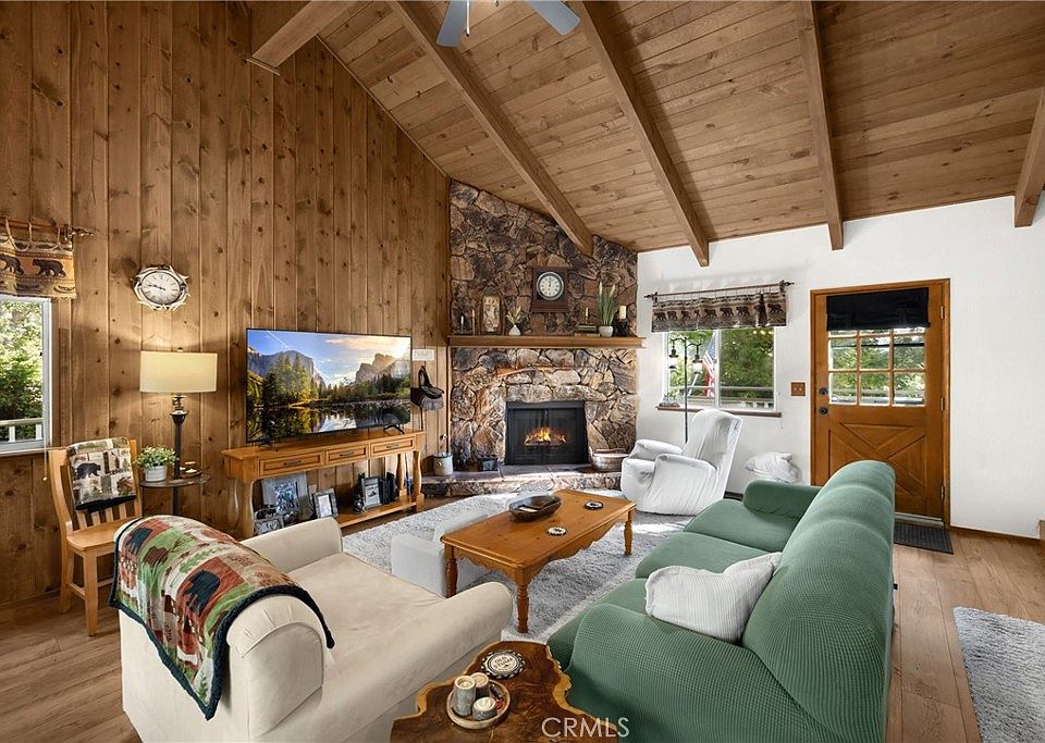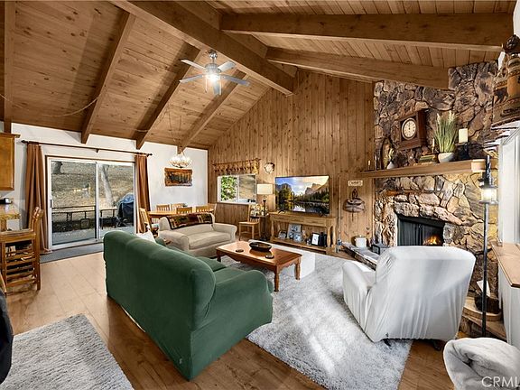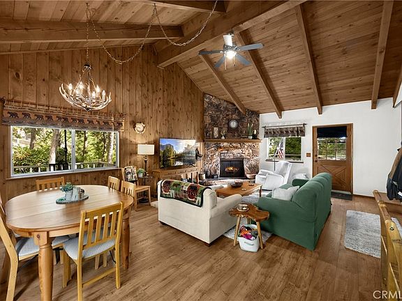 Nestled in the woods yet just a stone's throw from Lake Arrowhead WITH Lake Rights, this charming gem offers the perfect balance of seclusion and convenience. Well-maintained and ready for your next adventure, it's the idea place to unwind and reconnect with nature and the mountain environment. With dual access-from the front and rear-you have options for easy access with plenty of parking availability. Inside, you'll find an open living area with vaulted ceilings, tongue-and-groove wood paneling, and a cozy wood burning fireplace-perfect for those chilly winter days. The main floor features a spacious living room and dining area, a fully equipped kitchen, two bedrooms and a full bath. And, with the laundry conveniently located right across from the bedrooms, everyday living couldn't be easier. Upstairs you'll find the primary suite to be a true sanctuary. Soaring ceilings, a private en-suite bath, and plenty of closet space create a peaceful escape. There's also enough room for a small home office, reading nook, or yoga space, making this the perfect place to recharge. Wait .. there's more! The lower level is a mostly unfinished basement with plenty of room for storage-whether it's holiday decorations or lake toys, there's room for everything you need. Sold mostly furnished, this four season cabin makes transitioning to your mountain getaway simple. C'mon Up - the mountains and lake are waiting for you!