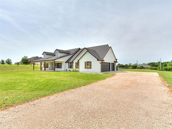 Additional highlights include durable and easy to maintain flooring (all tile or LVP - no carpet), a 3-car garage, high-end finishes throughout, water softener, reverse osmosis system in the kitchen, abundant storage, and an extended concrete back patio. An oversized in-ground storm shelter right off the back door provides peace of mind during Oklahoma storm season. Enjoy the great outdoors on your acreage with a portion conveniently fenced in for play.