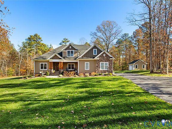 Welcome to this stunning Craftsman-style home perfectly situated on a private, wooded lot. This home offers the ideal blend of classic design and modern comfort, featuring high-quality finishes and thoughtful details throughout. The inviting front porch leads into an open-concept floor plan filled with natural light. The gourmet kitchen boasts custom white cabinetry, premium granite countertops, stainless steel appliances, and a large center island overlooking the family room—perfect for entertaining and everyday living. The adjacent living area showcases rich hardwood floors, elegant lighting, and exposed wood beams that add warmth and character. The spacious primary suite offers a relaxing retreat with a spa-inspired ensuite bath and generous closet space. Additional bedrooms provide flexibility for guests, home office, or hobby space. Enjoy the outdoors year-round in the beautifully landscaped backyard featuring a covered patio, outdoor fireplace, and pavilion with comfortable seating. The surrounding trees offer privacy and a peaceful setting for gatherings or quiet evenings.