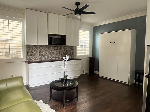 Unique set up. Separate entryway. French door access. Big open living area currently furnished OR unfurnished. your option. If you wanted furnished: it offers a new murphy full size bed, leather love seat sofa, side tables. Unit has a lot of windows with privacy, well lighted, ventilated, high vaulted ceilings, there is a built in Kitchenette with cooking countertop, microwave, refrigerator and kitchen cabinet countertop and space. Big full size bathroom with extra cabinetry and plenty of space for more storage you might desire.