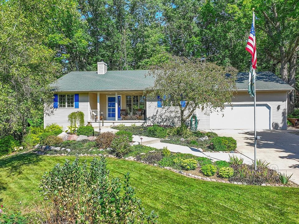 Perched atop a spacious wooded lot, this 4BR/3BA walkout ranch home greets w/ cathedral ceilings, split-bed layout, skylights & heart-pine doors! Fully-equipped kitchen w/ breakfast bar, walk-in pantry & china display. Cozy LR w/ stone-face gas FP. Primary bedroom w/ walk-in cls & en-suite bath w/ nifty touch-control lit mirror & gorgeous tiled+glass shower. Opposite, beds 2 & 3 share a 2nd full bath w/ generous hall storage nearby. LL boasts over 1200 sqft of finished space composed of an exercise room, large fam-rm w/ gas-stove, vessel sink wet-bar & split-log clad walls. Sliding door opens to patio & wooded scene. 4th bed is also a suite w/ full bath & w/i cls. Laundry includes W+D. WH 2023, furnace 2018. Back yard features custom stone landscaping & charming shed w/ covered entry.