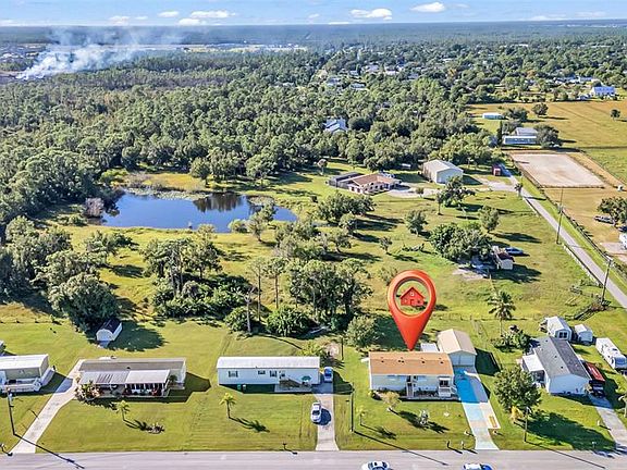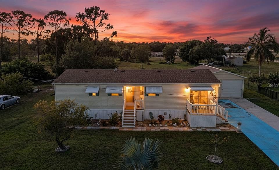 Welcome Home! This one checks all the boxes- this 2 bed 2 bath home offers true peace with 2 front porches and a screened in back porch! The solid 2023 roof will provide peace of mind as you greet your 2 friendly horses for back neighbors :) Bring your toys to your new detached large two car garage. Complete with parking pad and 30amp RV/Camper hookup. Feel secure in these Sheetrock walls. Spacious open kitchen, master bathroom has the perfect vanity. Under this mobile you will find tons of storage. Water system enclosed in additional storage shed. This property is located on a peaceful lot with quick access to US-41, I-75, shopping, dining, and historic downtown Punta Gorda. Located in a growing area, this home is perfect for those looking for their forever home or an investment property in beautiful Southwest Florida. No HOA or deed restrictions. Enjoy nearby boating, golf, parks, and Gulf Coast beaches. Don’t miss this opportunity to own a piece of paradise! ** This one is a MUST see in person.
