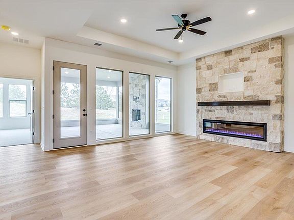 New zero entry home by Robl Building Co. This three bedroom two and a half bath home features an entry foyer, large entry closet, great room with large tray ceiling and linear electric fireplace with stone veneer. The great room is open to the kitchen and dining room. It also leads to the large screened patio with gas fireplace. The kitchen features a large prep island, quartz counter tops, abundant cabinets, walk in pantry and off the kitchen and dining area is a grilling covered patio. The owner's retreat is adjacent to the laundry area for the convenience of the homeowner and the huge owner's closet serves also as the safe room.. The attached bath has custom tile shower, double vanities, tile flooring and water closet. Additional features are an oversized three car garage with opener, lawn, landscaping, sprinkler and well. Located on a quiet cul de sac in the Sandcrest area which features a clubhouse, outdoor entertainment area with firepit, boating lake, two pools, pickleball court and playground. Call listing agent for showing information. Home is completed and MOVE IN READY! Information including taxes is deemed reliable but not guaranteed and may be changed without prior notice.