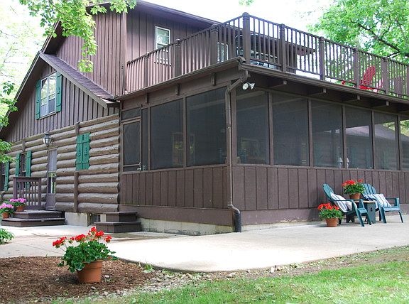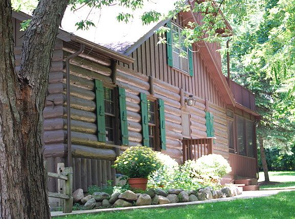 Luxurious log cabin home on quiet tree-lined street offers serene country living & in-town convenience! Close to downtown, schools,parks,train,hospital & more! Features incl. wood walls,hearth warming FP,large screened porch, hickory cabs, HWF'S in all rooms, private MBR level w/expansive deck overlooking north-woods-like private back yard, great storage areas, barn, charm and inviting private patios!