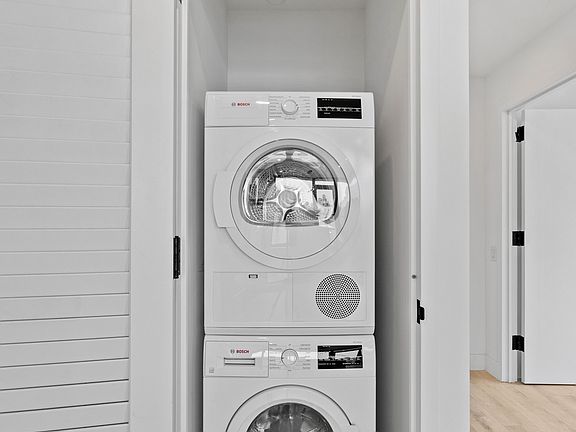The open-concept kitchen features white quartz countertops, light wood cabinetry, and a Bosch stainless-steel appliance package, including a built-in dishwasher and microwave. Matte-black fixtures and soft-close drawers complete the refined aesthetic. Both bedrooms offer generous closet space, while the bathrooms exude a spa-like atmosphere with deep soaking tubs, porcelain tilework, and wood-finish vanities.