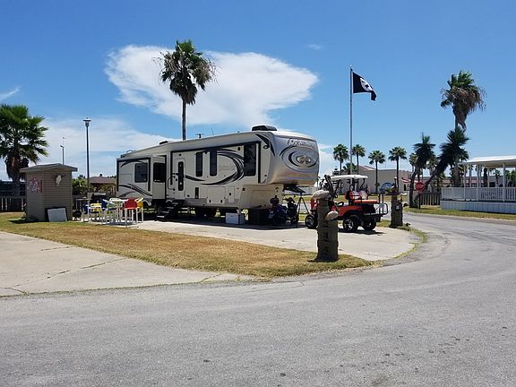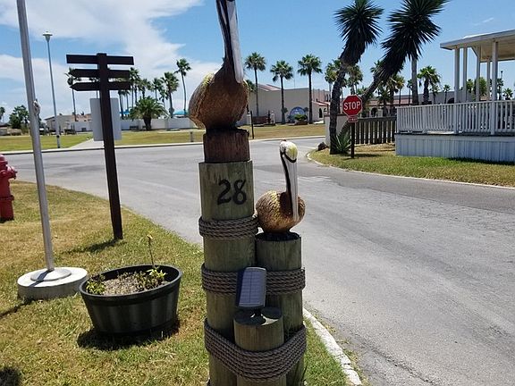 TREMENDOUS Location! This vacant interior lot is about as close to the many amenities found at Long Island Village as you can get. The sidewalk to the swimming pools/ hot tubs/ activity center/ workout facility and all the rest is literally right across the street and a bathhouse is across the street as well so this is the ultimate RV lot but is suitable for building a cottage home on as well. Current owner has added a new storage building and some beautiful driveway posts with wood-carved and hand-painted pelicans sitting on them. Look at the pics! There is currently a brand new 5th wheel trailer on the lot that does not convey but can be purchased separately or for an additional price.