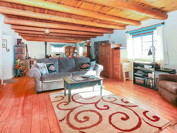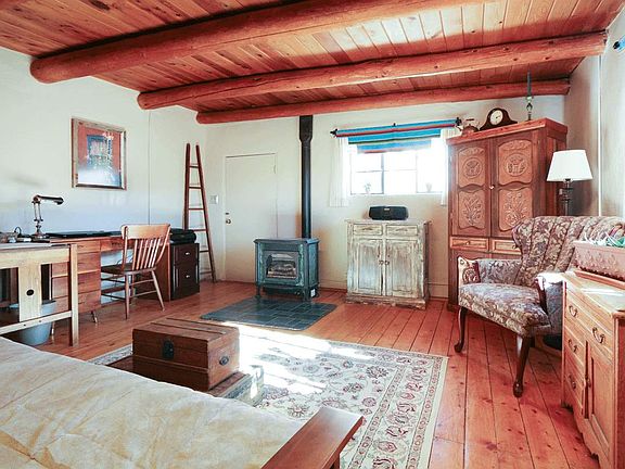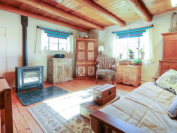 This sweet, immaculate 1BD/1BA/1400sf old adobe home is nestled on .25 of a beautiful acre. Closets throughout as well as storage and work sheds offer plenty of places to tuck things away. Plank and viga ceilings, thick adobe walls, a wood stove and two thermostat controlled gas stoves keep this gem nice and cozy in the the winter, while the shade trees and pleasant cross breeze keep it cool in the summer. Cherry, apricot and apple trees, a beautifully landscaped yard including a lawn, an irrigation ditch (with water rights), all make for the perfect spot to spend hours enjoying you own private oasis that is just minutes from town.