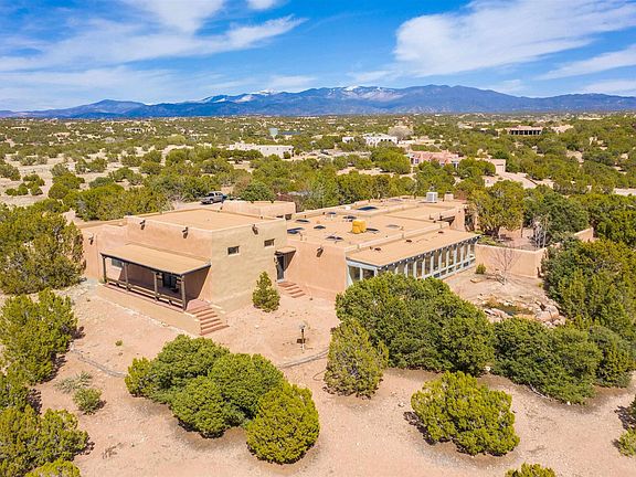 Romantic elegance, peaceful surroundings, and complete privacy encompass this magnificent Santa Fe home. If you would love to live surrounded by 360-degree views of the most beautiful mountain ranges in Northern New Mexico, this spacious home, with an abundance of character and Spanish / European style accents, is for you. This timeless 5,153 sq. ft. home offers a utopia of privacy, serenity, and quiet just a short 15 minute drive to the Santa Fe Plaza. Aspens, pinon, and junipers surround the five-acre property. Brick, wood, and tile floors, traditional wood-burning fireplaces, and high wooden beamed ceilings bring elegance and warmth to a well-thought-out floor plan. The house has a palatial living room, formal dining room, fabulous cooks' kitchen, and 4 bedrooms, one of which could be used as a separate suite. The sunroom leads to a large patio with a water fountain, perfect for entertaining and romantic dining. A spiral staircase leads to the rooftop for the ultimate view experience. In addition to the main house, there are several outbuildings including a small architectural greenhouse and studio /workshop with its own portal with forever views. NO HOA.