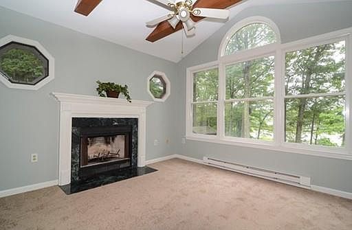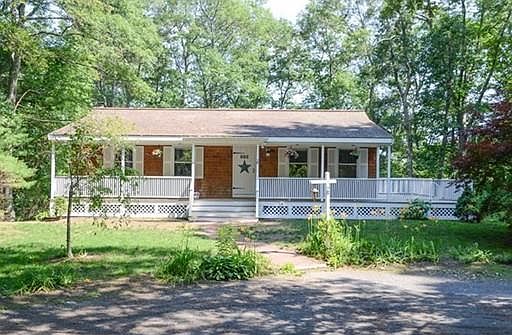 Ranch Style home with huge farmers porch and wrap around deck, set on 1.77 acre wooded waterfront lot with 250 feet of waterfront. Freshly painted interior and new wall to wall carpeting. Open floor plan with Kitchen open to vaulted familyroom with wood fireplace, large livingroom, 3 bedrooms including master bedroom with 1/2 bath. The walkout finished basement features a playroom with wood stove and slider to patio and back yard. The house is set at the end of street with beautiful wooded privacy. Conveniently located near commuter rail, highways and shopping.