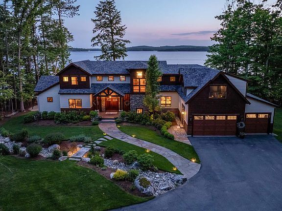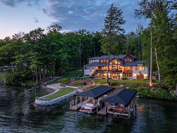 A rare offering on what is known as the "gold coast" of Moultonborough, nestled on a serene 1.4-acre level lot with 200 feet of crystal clear sparkling Winnipesaukee waterfront. This remarkable waterfront home offers an unparalleled lifestyle, boasting three levels of luxurious living space, the residence features a 1st floor primary suite & 4 additional en suite bedrooms, ensuring comfort & privacy for every member of the household. Enjoy the breathtaking Westerly exposure, granting stunning sunsets & all-day sun that illuminates the incredible custom interior. Beautifully open floor plan flows seamlessly into a stunning kitchen meticulously designed with a chef in mind offers high end appliances, and a large island, a dining room & living room with soaring ceilings & a stone fireplace. The 4-season room thoughtfully designed with year round grilling in mind, while decks & an expansive stone patio with a fire pit provide seamless indoor-outdoor living and entertaining spaces. The property is adorned with impeccable landscaping, showcasing the natural beauty of the surroundings. A three-car attached garage, complemented by a two-car detached garage, offers ample storage for vehicles and recreational equipment. With a jetty, sand beach, plus docking for three large boats, this waterfront oasis provides endless opportunities for water recreation and relaxation. A great location by car or by boat, this is more than a home—it's a sanctuary for luxurious waterfront living.