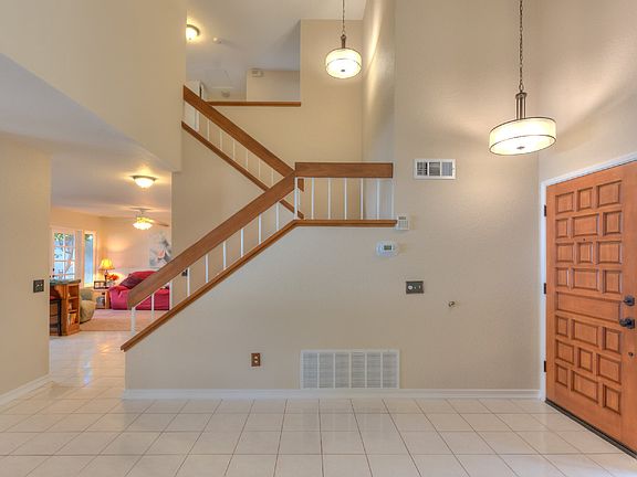 Gated entry for security with wireless bell with charming fountain by front entrance, newly refinished front door with gorgeous Venetian bronze hardware and brand new doorbell including new chime that will enchantingly announce your guests have arrived; they'll be greeted by freshly painted interior in neutral gorgeously soft two-tones which highlight angles in the high arched ceiling as you enter the home, while above the entrance is a beautiful new pendent light to match other new bronze hardware offering soft lighting offset by brand new carpet throughout leading to refinished kitchen cabinets with beautiful knobs and pulls for accent, newer 5-burner stove and microwave, dish washer, two minor kitchen remodels during lifetime of house include extra large double deep sink and kitchen tile counters with backsplash and added breakfast nook; beautiful marble-tile flooring (recently professionally steam cleaned) in entry, kitchen, dining room, hall, all baths and laundry room; carpet throughout home is brand new; in 2014 largest bedroom upstairs had laminate flooring installed offset by rich wood wall bookshelf; newer toilets and bath hardware in all bathrooms (including hardware guts in wall); master bedroom has walk-in closet with new double bulb light and mirrored closet doors and upgraded bathroom with new semi-frameless clear shower door; newly upgraded lighting including beautiful pendent lights in front entry and stair landing, Casablanca fans with lights in every bedroom and family room, new hall and laundry room lights to illuminate your way; newer energy efficient water heater, brand new 14.5 SEER HVAC system; newer energy efficient windows throughout home including double-pane faux colonials in front living room which features beautiful wood fireplace and wood storage area, sliding door in dining room flanked by lighting windows; charming French doors with beautiful Venetian bronze handles in family room open to peaceful cool patio and portico with gorgeous jasmine that blooms in spring offering scent that delights, and very large well cultivated yard with well established fruit trees and roses, BB court in backyard, bonus 9'X11' stucco storage building in back (with new roof) includes ventilation, electricity and water plus interior lighting and exterior floodlight; new sprinkler control unit and renovated sprinkler system front and back; front and side retainer walls re-stuccoed and freshly painted; house recently pressure washed and windows professionally cleaned; finished garage with lots of cabinet storage and automatic garage door flanked by charming new lights operated by photocell automatically on at dusk off at dawn; house roof recently inspected and repaired.