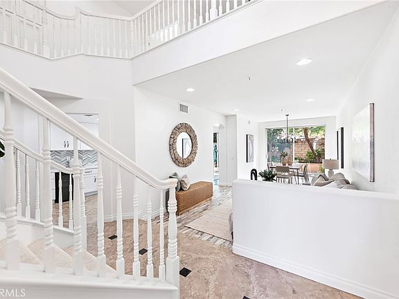 Welcome to 28 Chaumont where comfort and design come together in perfect harmony. This is the largest floor plan available within the exclusive gates of Marisol offering not just space, but an abundance of warmth and light. This inviting 3 bedroom home, complete with a versatile loft that can easily be transformed into the fourth bedroom, is a true sanctuary ---a place where beauty and functionality exist. As you enter you are greeted with soaring ceilings that draw you into a spacious living and dining area, perfect for both relaxation and entertaining. The newly renovated kitchen is a chefs dream, featuring stunning quartz countertops, an upgraded backsplash, a sleek stainless-steel sink, gas stove, pristine white shaker cabinets, and even a wine fridge for those special occasions. Upstairs consists of two secondary bedrooms, a loft and the lavish primary suite where high ceilings create a sense of openness and tranquility. Unwind in the spa like bathroom, complete with a soaking tub, walk in shower adorned with floor-to-ceiling granite, two separate vanity sinks and cedar lined walk-in-closet. Every detail of this home has been carefully considered from the freshly painted walls to the newly installed carpet, & remodeled kitchen and primary suite bathroom. Step outside to your private patio- a charming space that offers both privacy and a touch of nature. The community amenities include a sparkling pool and spa waiting for you to enjoy. You have access to Mission Viejo Lake where one can paddle board, kayak or simply lounge on the sandy beach. This is more than just a home; it's a lifestyle of comfort and ample amount of space waiting for you to embrace.