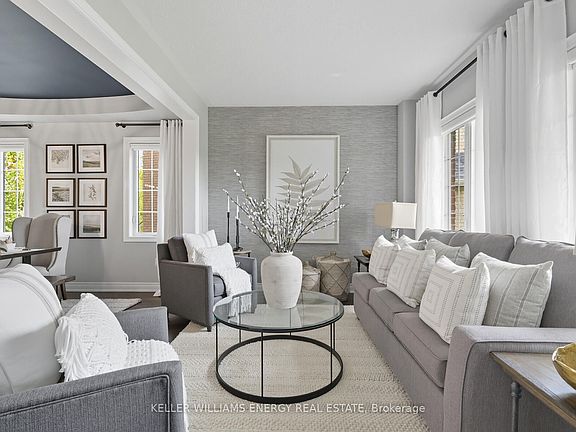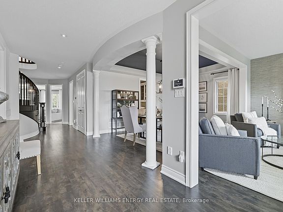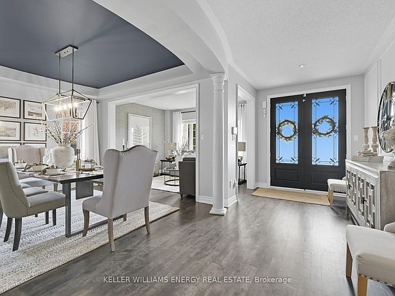 Experience refined living in this exceptional 4+1 bedroom Highmark-built residence, offering nearly 5,000 sq. ft. of finished space backing onto a serene ravine setting. Designed with both elegance and comfort in mind, this home showcases newly refinished hardwood floors, soaring 9-foot ceilings, and custom coffered and paneled wall finishes that create a warm yet sophisticated atmosphere. The chef-inspired gourmet kitchen features a large walk-in pantry, butlers servery, expansive dining area, and a sunlit eat-in breakfast space with a walkout to a custom Aztec composite deck. Perfect for entertaining, the deck overlooks the lush ravine and beautifully landscaped premium pie-shaped lot. Measuring 87.76 feet across the rear fence line, 129 feet along the west side, and 117 feet along the east side, this irregular lot offers the rare advantage of a true pool-sized lota backyard canvas ready to accommodate a future pool, cabana, or outdoor retreat. Complete with under-deck seating for year-round gatherings, this private yard delivers exceptional space for relaxation and entertaining. The oversized primary retreat is a true escape with a walk-in closet, sitting area, and double-sided fireplace that flows into a spa-like ensuite. The flexible 4+1 layout includes a main floor office and a fully finished 1,235 sq. ft. lower level with a fifth bedroom with 3-piece ensuite, multiple recreation areas, a wet bar, and a walkout to the backyard. Inside, the details impress at every turn: three gas fireplaces, custom moldings, and thoughtful finishes that balance functionality with luxury. Located minutes to Highway 407, top schools, parks, and all the amenities Whitby has to offer, this home seamlessly combines convenience, elegance, and lifestyle.