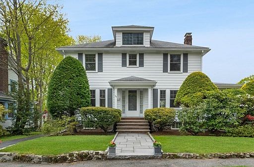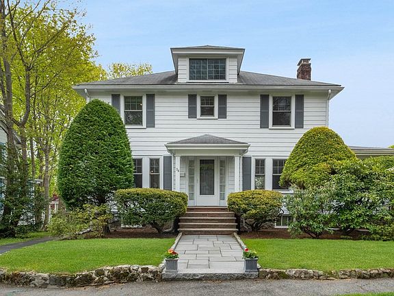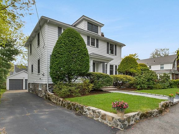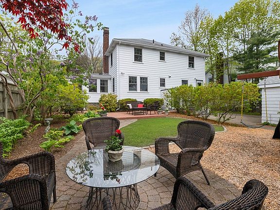 Classic and lovingly maintained 1934 Center Entrance Colonial short walk to Glover School. Elegant foyer, high ceilings, hardwood floors throughout, period moldings and details. Newer Andersen windows throughout, new Hot Water 2022, see meticulous maintenance records in attached document in MLS. Lovely flat yard with beautiful gardens, play structure, and multiple sitting areas, perfect for relaxing and entertaining. Living room with fireplace, Dining room with mahogany wainscoting and moldings, eat in white, stainless, and granite kitchen with breakfast nook and built in desk. Convenient access from garage/parking to mudroom to kitchen. Finished basement offers playroom or office space with separate glass door entrance to back yard, separate laundry room and workshop. Full walk up attic accessed off of hallway offers excellent potential for expansion.Second floor offers 3 BRs plus office/dressing room off primary. Potential to add 2nd full bath easily. 2 C garage.