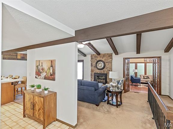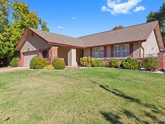 Discover comfort, character, and time capsule charm in this beautifully maintained 3-bedroom, 2-bath home, nestled on a peaceful cul-de-sac street lined with mature trees and streetlights. While not located in the cul-de-sac itself, the home enjoys a quiet setting with minimal traffic and a serene neighborhood vibe that’s hard to find in newer developments. The partial brick exterior and double front doors make moving in easy, while the covered front porch with aggregate concrete adds to the home’s curb appeal and offers a great place to relax. Inside, you’ll find a vaulted and beamed ceiling in the living room, a stunning stone-faced gas fireplace, and an adjacent vaulted atrium room filled with natural light—ideal as an exercise room, indoor garden, or peaceful retreat. The kitchen offers a functional layout with stainless steel appliances, a breakfast bar, and a cozy breakfast room—perfect for casual dining. The primary suite features a walk-in closet, a sunny sitting space, and a refreshed en suite bath with a granite vanity and soaking tub. The shower portion was removed, but the plumbing remains in the wall. Secondary bedrooms both include ceiling fans and plantation shutters, and they share a hall bath that has also been updated with granite finishes. From the living room, step through the sliding door to a composite deck overlooking a flat, fully fenced backyard framed by a 6-foot cedar privacy fence. It’s the perfect space for pets, entertaining, or simply unwinding in your own private outdoor space. The finished 2-car garage offers extra convenience and storage. The large blank canvas basement can be an all-seasons play space or designed and styled into your perfect lower-level retreat. Mechanical updates include a high-efficiency furnace and AC system installed in 2022, and Class 4 impact-resistant shingles—offering peace of mind and potential insurance savings. This home perfectly blends thoughtful updates with enduring quality and a setting that offers mature trees, neighborhood charm, and a level of peace that new construction can’t match. Come experience this rare blend of comfort, privacy, and timeless appeal—your next home might already be waiting. Francis Howell North! Don't Sleep on Your Dream Home, Sleep in It! OPEN HOUSE Sunday, Nov 2nd from 1pm - 3pm. (Don't forget to change your clocks!)