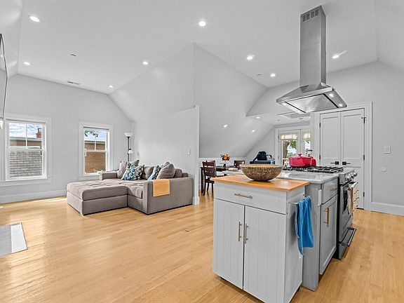 MOTIVATED SELLER. Stylish Top-Floor Condo with City Views & Modern Finishes. This meticulously maintained iron grey clapboard home offers a bright, open-concept 3rd floor unit with vaulted ceilings, city views, and a cozy gas fireplace. The updated white kitchen features a large island, marble countertops, and premium KitchenAid appliances, flowing into a spacious dining area that opens to a large private deck—perfect for outdoor entertaining. With two generous bedrooms and two full bathrooms, this unit also includes in-unit laundry, a Nest thermostat, and a video doorbell. Enjoy two off-street parking spaces, basement storage, and a large shared lawn for recreation or relaxation. Ideally located near Shawmut & Fields Corner stations and local favorites like Via Cannuccia and Homestead Bakery, this home combines comfort, style, and convenience.