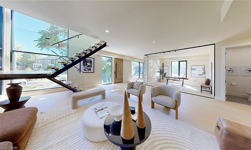 Bright contemporary designShowpiece glass staircaseOpen-concept main floorDedicated officeChef-inspired kitchenBosch appliancesBertazzoni cooktop