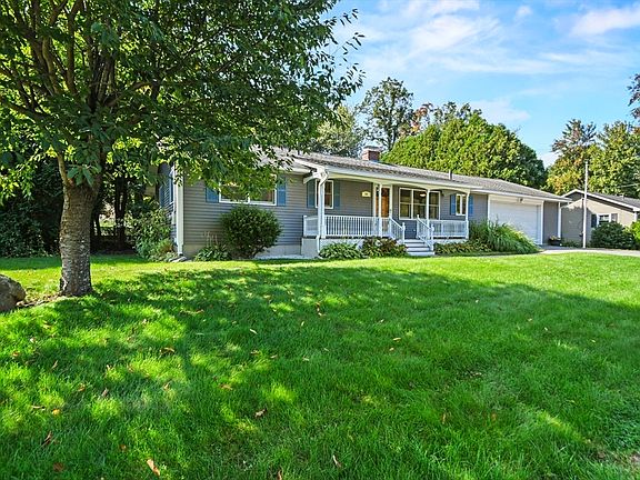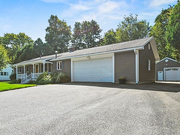 Welcome Home! An inviting covered front porch sets the tone for this spacious and well-designed property. Enter inside to a spacious sun-filled eat-in kitchen with breakfast bar and dining area, highlighted by a double-sided fireplace shared with the formal dining room, which features custom built-in shelving and cabinets. The family room impresses with a vaulted pine shiplap ceiling, mini-split, recessed lighting, and a sliding glass door leading to the backyard patio. Down the hall, you’ll find a full bath, a generous primary bedroom with its own private bath and two additional bedrooms. Need more space? The finished basement offers two versatile bonus rooms and a half bath plus laundry - perfect for work, play or guests. Outside, enjoy a large partially fenced backyard with two patio areas, a storage shed and an oversized detached garage/workshop. Parking and storage are abundant here! Don’t miss your chance to make this wonderful home yours! Close to Elem. and Middle schools