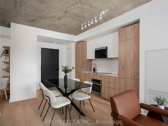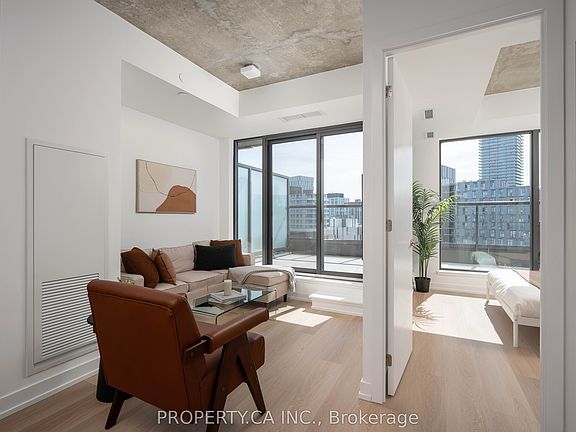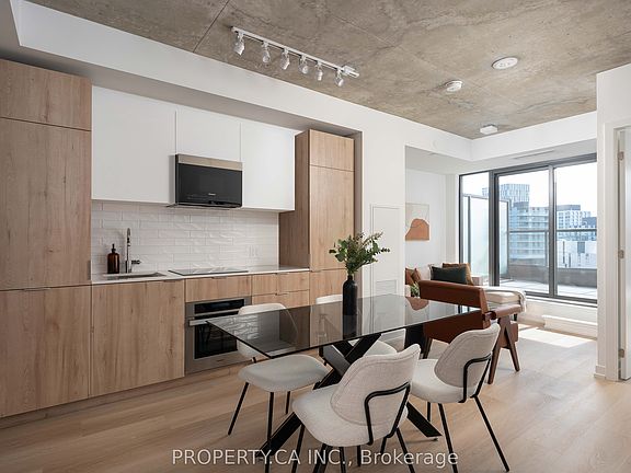 Welcome to 28 Eastern, Alterra's new luxury boutique condominium in the heart of historic Corktown, just steps from the Distillery District. This stunning 1-bedroom plus den, 2-bathroom suite defines sophisticated soft-loft living with its soaring 9-foot ceilings and sleek laminate flooring throughout. The open-concept layout is exceptionally bright and functional, featuring a modern kitchen that flows seamlessly into the living and dining area. The primary bedroom serves as a private retreat with its own spa-like ensuite bathroom. A key feature is the versatile den, ideally sized for a home office, which is conveniently located adjacent to the second full bathroom, a rare and highly desirable layout. The undisputed highlight is the massive open terrace, offering stunning south views of the downtown Toronto skyline. This true outdoor oasis is perfect for dining and entertaining. Residents of 28 Eastern enjoy world-class amenities, including a 24-hour concierge, a fitness centre, a co-working lounge, and a stunning rooftop terrace. With the St. Lawrence Market and the King streetcar at your doorstep, this is urban living at its finest. An oversized private locker is included and a tandem EV parking spot can be made available upon request at an added cost.