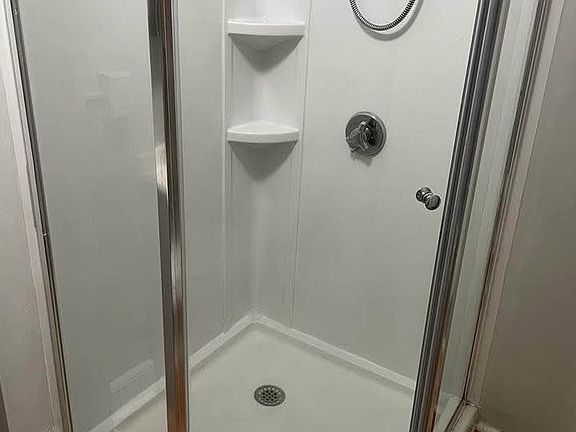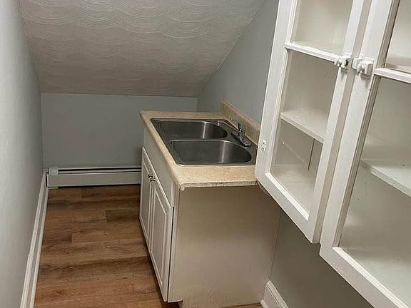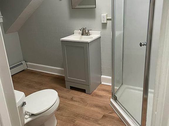 This is a newly renovated, compact apartment defined by its appealing modern finishes and character provided by the sloped ceilings of its top-floor location. The entire space features new plank flooring, utilizing both a gray and a light brown wood-look style, complemented by fresh light gray walls. The functional kitchen area includes a gas stove/range, a double stainless steel sink in a separate alcove, and an adjacent glass-front storage cabinet. The bathroom is fully updated with a contemporary gray vanity and an efficient corner walk-in shower with a glass enclosure.