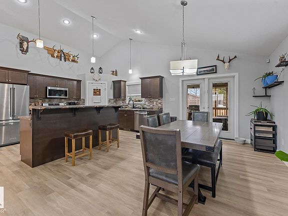 Modern feel Hailey style home with 3 bedrooms & garage access off the top 2 levels PLUS AN IN-LAW SUITE IN BASEMENT( with separate entry, full kitchen + laundry!) ASPEN RIDGE, a family friendly subdivision! Open concept with vaulted ceilings! Main level with new flooring. Large windows through-out this home! Livingroom with gas fireplace, spacious dining area with patio doors leading to a covered back deck! Kitchen with dark cabinetry, pantry, all appliances included plus island with eating bar. 2 bedrooms and 4 piece bathroom complete main level. Primary bedroom just up a few stairs (king size bed large with walkin closet and 4 piece ensuite). Access to utility room with laundry as well. THE BASEMENT has a separate side entrance and includes: 2 bedrooms + 3 piece bathroom. Open livingroom, dining and a full modern 2nd kitchen with appliances. PLUS laundry of its own. Basement roughed-in for underslab heat, garage has a gas line installed for a future heater+yard is fenced. Concrete drive. Welcome home!