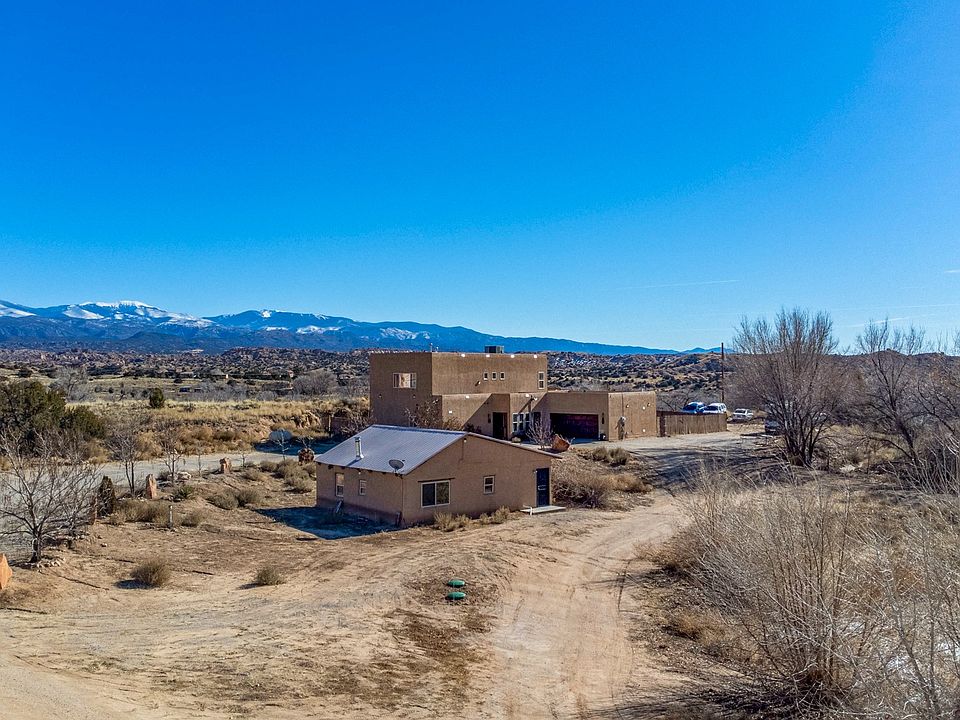 Beautiful property located in Santa Fe County. House and guest house/studio sited on +/- 1.68 acres with the most amazing mountain views that will take your breath away and is only 25 minutes to Santa Fe. The main home is appx 2300 sqft & boasts 3 bedrooms (1 bedroom and en-ensuite full bath downstairs) plus an office/game room, 3 baths, living room with gas kiva fireplace, large laundry room with washer, dryer & sink . The 2 car garage with stained concrete floors has been converted into an entertainment area/space (unheated and not included in the heated space sqft), would be perfect as an art studio, work-out room etc. or convert back to a 2 car garage with direct entry into the home. The open concept kitchen has granite tile counters, a breakfast bar, tons of cabinet space, some stainless steel appliances, track lighting, can lighting & a desk area. All bathrooms have granite countertops and tubs with tile tub enclosure. Huge owners suite (with his and her walk-in closets) has doors leading to a beautiful wrap-around deck perfect for drinking morning coffee and admiring the views. The lovely owners en-suite bath has double vanities with granite counters and a jetted tub. Parking is endless for cars and RV's or boats for that matter. Guest house/studio with pro-panel roof has brick floors, vigas and a 3/4 bath. Main home features and amenities: Brick floors-Ceiling fans-Wood doors-Enclosed/fenced yard-Radiant in floor heat-A/C-Hot water baseboard heat upstairs and more.