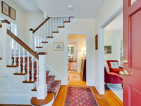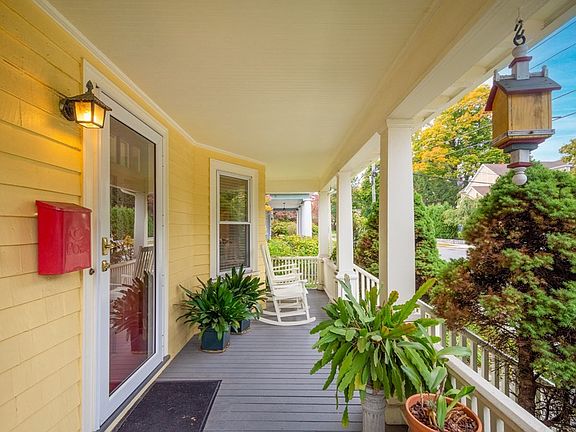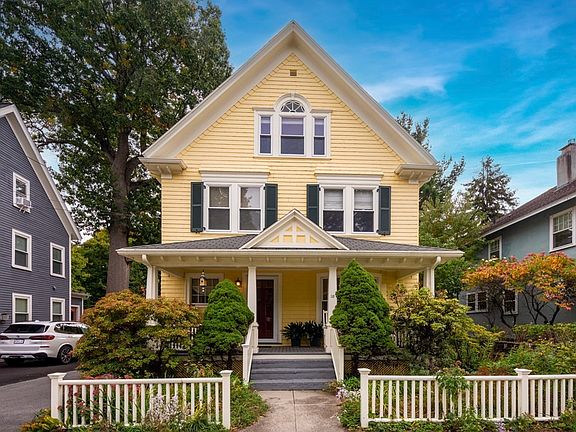 This romantic, colonial w/ white picket fence, covered front porch, Brazilian ipe back deck w/ native wisteria & trumpetvine covered arbor, patio leading to open yard for gameplaying sets the stage for the elegance of the home. One is greeted in the foyer to a classic turned staircase. The fireplaced living room has a bay window flanked by 2 bookcases. Dining room has beehive alcove with built-in cabinet & bay window. Tastefully updated kitchen is a cook's delight w/ many cabinets, double oven, honed limestone counters & recessed lights, & provides great flexibility to have either a cathedral ceiling eating area or family room w/ mudroom area from the 2-car garage. The 2nd floor includes 3 generously sized bedrms w/ generous closet space plus an office & updated bath w/ 2 sinks, basketweave marble flooring, marble counter & surround over the tub. Surprises continue to the 3rd floor; front bedrm w/ stained glass window, rear bedrm w/ alcove. Full bath w/ 2 skylights & marble throughout.