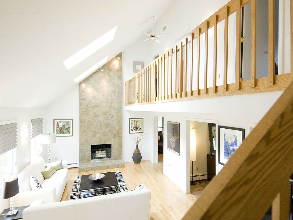 Newly reduced price on this sun-filled contemporary home... Gorgeous loft-like open living area with vaulted ceilings, skylights & dramatic fireplace. Smart s/g kitchen with custom cabinetry and dual ovens opens to the gracious dining space. 1st fl. also offers a large powder room & charming office/guest room. Upstairs a spacious master awaits with 2 walk-ins, luxurious bath and en suite lounge. 2 addt'l bedrooms and a full bath overlook the living area. Large lot w/big fenced-in yard & 2-car garage!