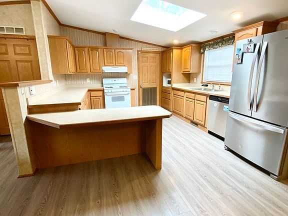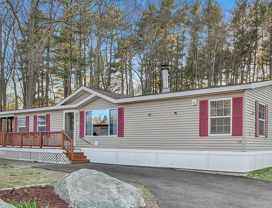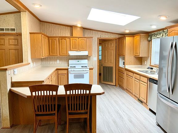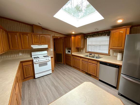 Calling 1st time home buyers- here is a good opportunity to buy a 2005 built home OR calling all retirees this is a great alternative for downsizers. This move in ready, double wide home features new carpeting, new vinyl plank flooring, new roof & hot water heater. Huge living room with stone faced wood burning fireplace, opens to eat in skylighted kitchen with updated appliances & breakfast bar. Main bedroom suite has garden soaker tub with separate shower stall & full vanity. Second bedroom features separate bathroom with double vanity, shower and walk in closet. Back entryway mudroom is also a laundry area & includes washer and dryer, plenty of closet and storage space. Plus central air, wrap around deck & covered back porch. Mogan Mobile Park is not age restricted & is a pet friendly park. Monthly lot rent includes water, sewer, trash pickup, road maintenance, snow plowing, real estate taxes too. All this, a great location and beautiful school campus!