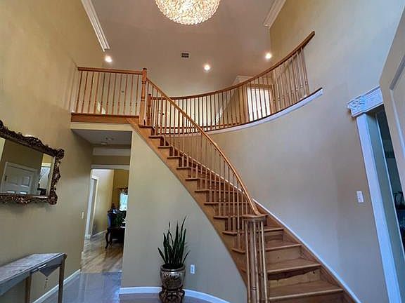 A magnificent 6 bedroom 4 bath colonial situated in the beautiful tower section of North Edison. Highlights include an immaculate curved stairwell, 2 story high ceiling foyer with large golden crystal chandelier, 2 story living room, upstairs extended curved balcony overlooking living room, open floor plan concept, huge primary bedroom with sitting area, walkin closet with closet system built in, primary bathroom is equipped with jacuzzi tub w/ 6 jets, a separate standing shower and two sink vanity. A grand gourmet eat-in kitchen consists of 3 walls of cabinets and granite countertop with wine rack side of the cabinetry and countertop newly installed, SS appliances (2017), a large center island, double door pantry, and sliders leading to the spacious deck to enjoy the scenic backyard view. There is a bedroom and full bath on the first floor. Gleaming solid hardwood and granite floorings, recessed lightings, detailed moldings and crown moldings throughout and chair rail molding in dining room. Two zone cooling and heating systems. 9 ft ceiling on the first floor. A full basement with 13 course high ceiling, partially finished with the walls and floors painted, offering plenty of space for exercise, activities and storages. Conveniently 10 minute strides to Metropark train station, yet the home is located in the middle of a cul-de-sac street, very secluded and quiet neighborhood. Close to shops, restaurants, parks, shopping malls and JFK hospital.
