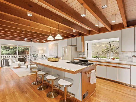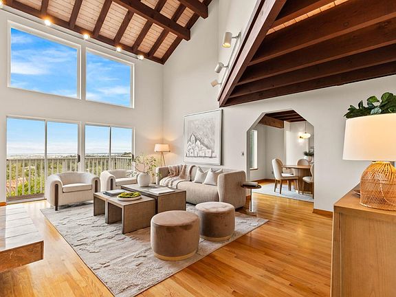 Mid-century vibe meets modern comfort and serenity comes with a view! This custom 4-bedroom, 4-bath San Carlos retreat offers over 3,000 sq ft designed to impress: dramatic open-beam ceilings, walls of glass, and bedrooms that frame nature at every turn. Feel the calm, quiet energy while under vaulted ceilings, sip sunset cocktails, or enjoy cozy mornings by the fireplace in the primary suite with its own balcony. This thoughtful floor plan balances flexibility to work-from-home, multigenerational living, or a potential ADU. The spacious dining room with views and generous kitchen both stand ready as the heart of the home. 2-car garage plus bonus basement add room for hobbies, storage, or your next big project. Just minutes to top-rated schools, vibrant downtown, and nearby trails, this rare find is pure Kirkwood cool offering scale, soul, and views in the City of Good Living.