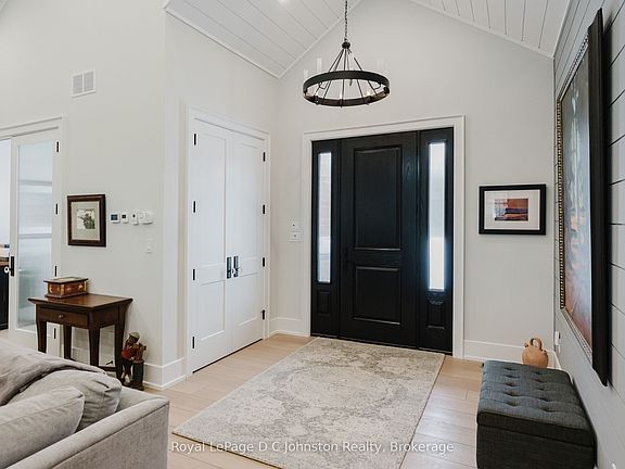 Introducing an architectural masterpiece where bespoke craftsmanship meets unparalleled luxury. Step inside this stunning 3267 square foot bungalow, built without stairs on grade, and immediately experience the soaring great room with a vaulted white shiplap ceiling, a custom floor-to-ceiling stone gas fireplace, and a sleek wet bar with Marvel bar fridge. This space seamlessly flows into the gourmet kitchen and dining area, which are defined by Douglas fir ceiling beams and a white washed tongue and groove ceiling. The kitchen is outfitted with gorgeous maple cabinetry, upscale Thermador appliances, a quartz island with a waterfall edge and a large walk in pantry. The property extends its entertaining opulence to a fully enclosed 650 square foot three season sunroom featuring a second gas fireplace, spectacular milled Douglas fir ceilings and beams and heated sandblasted stone floors. A serene primary suite awaits, complete with a vaulted shiplap ceiling, walk-out to a large covered porch and ensuite featuring an oversized walk-in shower and freestanding tub. The split-plan design separates the guest bedrooms and bath for ultimate privacy. The home features a 500 square foot bonus room with a full bath and separate heating/cooling above the garage. Equally focused on functional luxury, there is a dedicated laundry room with custom cabinetry and quartz countertops, as well as a mudroom with coordinating maple cabinets and quartz counters - providing an elegant transition from the oversized double garage. Every detail, from the exquisite millwork, heated towel bars, in-floor gas hot water heating, Generac standby generator,, speaks to a life of refined comfort. Situated midway between Port Elgin and Southampton, this absolutely exquisite home, clad in stone and Maibec wood siding on a private wooded lot, is ideally located to take full advantage of the coveted four-season lakeside lifestyle Saugeen Shores is known for.