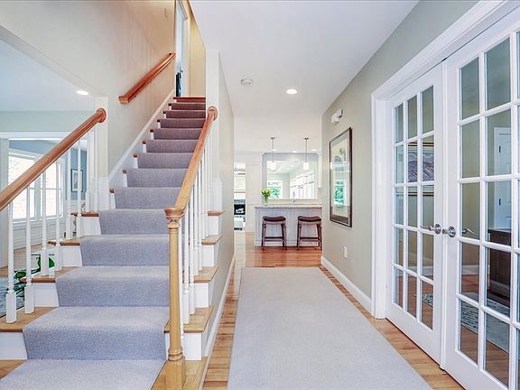 Captivating and Stunning, this 10-room, beautifully updated contemporary colonial features hardwood flooring and quality craftsmanship throughout. The inviting family room, surrounded by windows and crown moldings, offers a handsome stone fireplace and built-ins and leads to a private patio and expansive, lush grounds ideal for al fresco dining, play or the potential for a pool addition. Tastefully updated with quartz counters, peninsula and SS appliances, the kitchen flows nicely into the dining room and cozy living room. A first-floor office, butler's pantry and 1/2 bath compliment this home's thoughtful design. Picturesque pond views from the lovely primary suite make this the perfect place for respite and relaxation. Three generous bedrooms, a guest bath and laundry room complete the 2nd level. A huge exercise room and office are located on the 3rd floor. This exceptional home provides all the elements for today's sophisticated lifestyle in this charming coastal community.