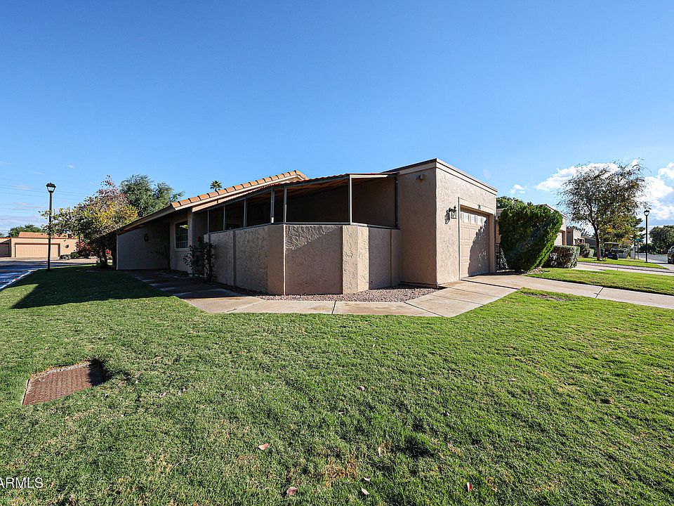 This cozy condo offers easy living with tile floors throughout and an updated kitchen featuring refreshed cabinets, a modern backsplash, and sleek countertops. A huge pantry provides exceptional storage, while the covered private front patio offers a peaceful spot to relax. The bathroom has beautiful tile work, and the home is free of popcorn ceilings for a clean look. Located close to pickle ball, tennis complex, swimming, state of the art work out facility, billiards, wood shop, ceramics and so much more. this home is a wonderful opportunity to enjoy comfort, convenience and a vibrant community.