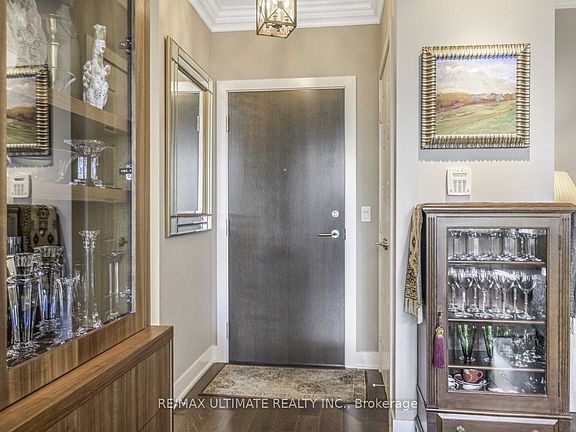 WOW! Stunning South/East corner suite in Tridel built James Cooper Mansion. Very unique 395 sq. ft. Terrace overlooking stunning South view, tree tops & even the CN Tower. Enjoy the clear city views, the sparkling night time city lights & vistas. Beautiful! Tucked in an enclave that is quiet & serene with easy access to the subway, TTC, & walking distance to shops. Entertain in style...inside or outside on the Terrace. There is a natural gas BBQ hookup so you can BBQ all year long! A warm welcoming foyer with front closet which opens onto the open concept Living/Dining room. Currently the Dining room is being used as a musical area. The Living room has a wall to wall custom built walnut cabinet & a double French door to the 2nd BR which is currently being used as a Dining room. Spacious kitchen with SS appliances & a fabulous eat-in breakfast area. The Primary Bedroom is one of the largest in the Building with a walk-in closet & a double mirrored closet, plus a 4pc ensuite. This corner suite has lots of natural light from all the large picture windows. There is also a 3pc bath & a laundry closet with stacked washer/dryer. Engineered hardwood flooring in main areas, ceramic flooring in kitchen & baths, crown molding & pot lights throughout. Both the Parking (which has space for 2 bicycle spots) & the locker are close to the elevator. The warmth of the tasteful touches welcomes one to truly enjoy & call this condo.....HOME!