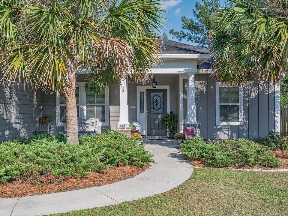 Welcome to 28 Mallard Pond Circle located in the popular Mallard Pond subdivision. This well maintained Southern Construction home features granite countertops, stainless appliances, custom wood cabinets, formal dining, eat in kitchen, upgraded trim package and beautiful engineered wood floors. The master bath has a double vanity, jetted tub and large walk in closet. There is a separate drop area located next to the laundry room. The exterior features beautiful lush landscaping with palms and a full irrigation system, covered back screened patio overlooking a large backyard with a firepit area that backs up a large open meadow.