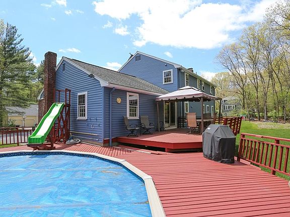 Wonderful classic colonial located on cul-de-sac. Picturesque yard with plantings, granite walkways,garden area and large deck area with solar heated pool for outdoor living. Updated eat in kitchen with corian counter tops, gas cooking, extensive cabinet space and sliders out to the deck overlooking the private back yard. There is a nice size family room with fireplace, dining room large enough for family gatherings, formal living room with fireplace, and office space off the kitchen. The large master bedroom has it's own en suite updated bath and walk in closet. The three other bedrooms are a nice size with good closet space. All baths have been updated, there are hardwood floors throughout, central air conditioning, game room in the lower level. Several rooms have been recently painted. The hot water is solar powered, generator hookup, and so much more. This is a wonderful home to call your own, that has been meticulously maintained.