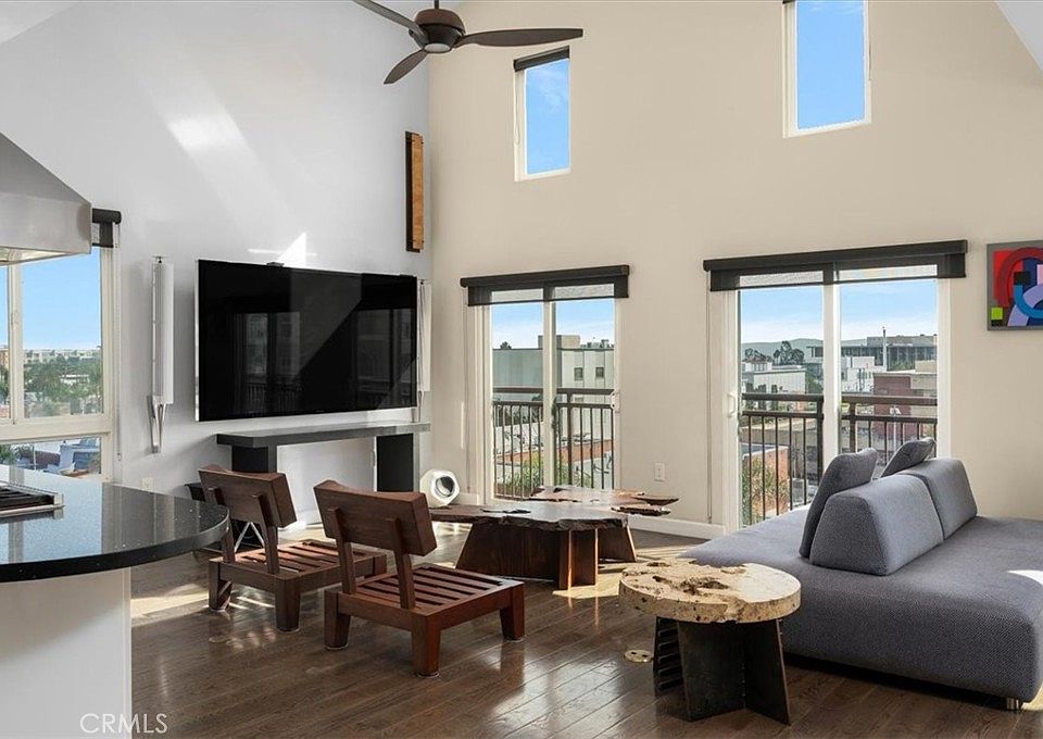 *Modern Top-Floor One-level Unit with Soaring Ceilings* Experience urban living at its finest in this beautifully custom designed two-bedroom, two-bath top-floor residence featuring a dramatic 14-foot vaulted ceiling, hardwood floors, and a spacious balcony accented with artistic décor. Built in 2015 within a gated community, this home offers a perfect blend of style, comfort, and convenience.