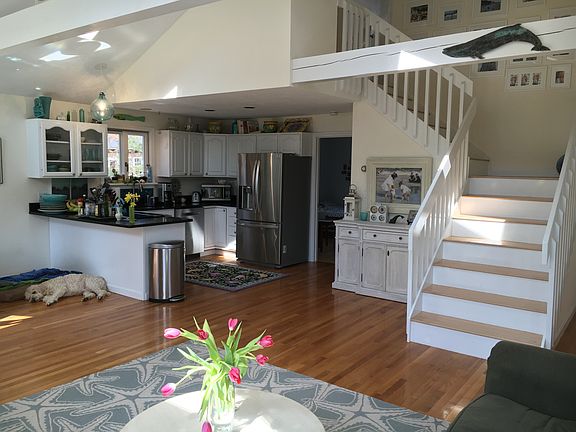 Modern contemporary home that was tastefully renovated in 2013-2014. Many special touches have been added to make this home look light, bright, and welcoming. Open floor plan with cathedral ceiling. The kitchen has a new black granite counter top with extended bar and stainless steel appliances. Kitchen is open to the dining and living areas. The wood burning fire place is the focal point of this room. There are two large slider doors on each side of the fireplace that open onto the large wrap-around deck. The large windows allow natural light to filter through the first floor. There are two bedrooms with bamboo flooring and a full bath on this level. The bathrooms are all remodeled with new fixtures and Carrera marble showers. The master bedroom is located on the second floor. It is a spacious room with large windows and sky lights. The private, full bath with Jacuzzi tub is right off the bedroom. Beautifully finished walk out lower level with a cozy living area, two bedrooms, full bathroom, tile and wood flooring. There is a slider from this room leading to a patio and the yard. Leland Cypress surround the property, giving the lot privacy. The manicured yard, parking area, and hardscape are all thoughtfully designed. Located in an area not far from the Vineyard Haven Yacht Club, library and town.