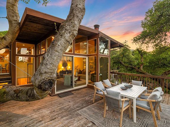 At the end of a peaceful dead-end street, this warm, inviting, and exquisitely unique property delights and surprises with architectural details and magical surroundings that invoke a far-away lodge retreat which, somehow, is mere minutes from downtown Los Gatos. Stunning architectural details include vaulted plank-and-beam ceilings throughout the open-concept first floor with its great room with wet bar, open kitchen with wrap-around eating bar and clerestory windows, and a sunken family room centered around a wood stove and surrounded by windows and sliding doors with direct access to the expansive back deck nestled among the trees. A bedroom with full bath and laundry room completes the main floor. On the lower level, two additional bedrooms share a breathtaking full bathroom with dual-sink vanity and a custom shower with an arched window overlooking the lower spa deck, plus direct deck access. This distinctive home will amaze and enchant you!