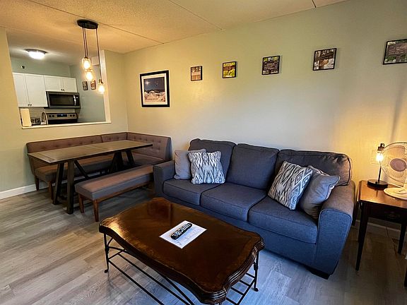 Just in time for snow season... This one bedroom Golden Eagle Lodge condo is in a great location, on the quiet 5th floor with pretty seasonal mountain views! Enter the condo to find a galley style kitchen (new appliances in 2023) and open living room/dining area floorplan. Improvements include new furnishings, flooring and lighting in 2023. The large bedroom easily accomodates a king sized bed and also offers a great nook to be used as an additional sleeping space or home office. The Golden Eagle Lodge has an on-site rental program that can provide income to help subsidize costs. This condo has a strong rental history, even with the owner's personal use. The Golden Eagle Lodge is centrally located overlooking Corcoran's Pond with an easy walk to Town Square, shopping, dining and the White Mountain Athletic Club. On-site amenities include an indoor pool and new hot tub, sauna, indoor ski and bike storage, ski tuning space, game room, coin-op laundry, a beautiful grand lobby, function space, outdoor patio with grills, playground and much more. Cable and internet is included in the condo fee! All the work has been done here, and the property comes fully furnished and equipped. EV charging station in the newly paved parking lot. New roof in 2024. (Sorry, pets are not allowed in the GEL. All short term rentals must go through the Golden Eagle Lodge rental management program)