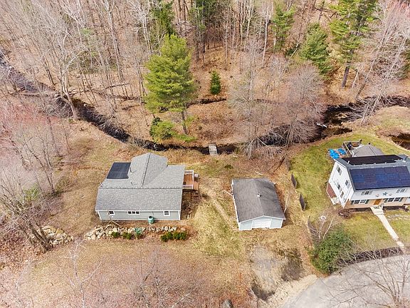 Check out this updated ranch in a charming country setting with a peaceful stream behind the property. This Home Features a unique layout, which offers plenty of sunlight and views of the private wooded area which surrounds the property. This home has an open concept Kitchen and Dining Room with a wood stove wrapped in a brick surround opening to the sundrenched Living Room. Pine accents carry throughout the home from full and accent ceilings to the walls. With 2 Bedrooms, a Full Bath with Laundry hookups, and a Bonus Room leading to the composite deck and brick patio where you can enjoy a nice cup of coffee every morning. From the patio wander back and enjoy a tranquil setting view overlooking the bridge crossing over the South Branch Souhegan River that runs through the backyard. A detached garage provides additional parking/storage space. Single-level living is easy in this ready-to-move-in home. Close to main commuter Route 119. Schedule your private showing today!