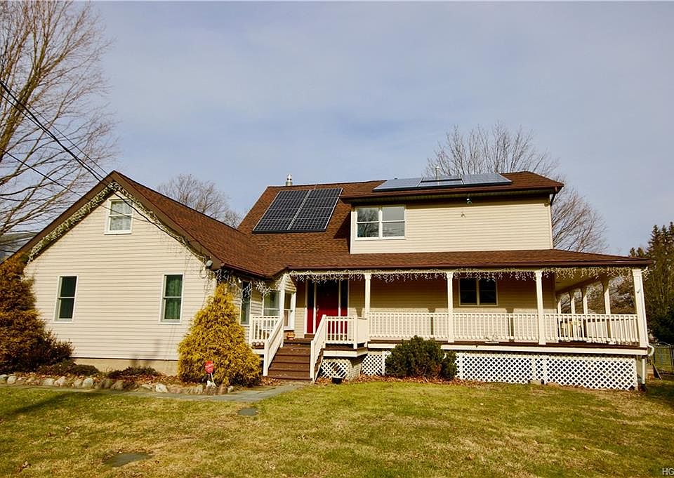 Don't miss this spectacular Country Colonial with picturesque wrap around porch and gorgeous Acre property! Endless possibilities with this unique open floor plan including first floor bedroom suite with full bath & private entrance. Entertain in the expansive Great Room with beautiful Hardwood Floors & gas fireplace and step out to large back deck with covered porch. A Regal sized Dining room with French doors leads to the enormous Center Island Kitchen with additional access to deck and partially fenced yard. Upstairs is the large Master Suite with renovated full bath, two more bedrooms & Main full bath , Laundry room and a play room & Loft. The walk out downstairs is finished with a French drain system/Lifetime warranty & has many uses with large Recreation rm, office with legal egress window, half bath & abundant storage areas. Well water has UV filters and Culligan water softener system. Solar Panels lease covers 100% of usage. Don't wait or you will miss this one of a kind home!