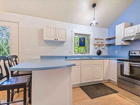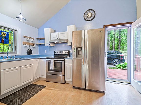 Discover the charm of this country cape—an ideal starter home nestled on 1.2 wooded acres with easy access to the highway. This efficient, low-maintenance home features 2-3 bedroom, 1 beautifully updated full bath, and an inviting open-concept living area with vaulted ceilings, newer stainless steel appliances, and is freshly painted. You'll appreciate the newer mini split for heating and cooling. Featuring a 3-bedroom septic system there is potential for future expansion, complemented by a partially finished room in the basement. Enjoy BBQ's or entertain guests on the side deck or additional back deck patio/platform. Move-in ready and full of possibilities, this home is a must-see!