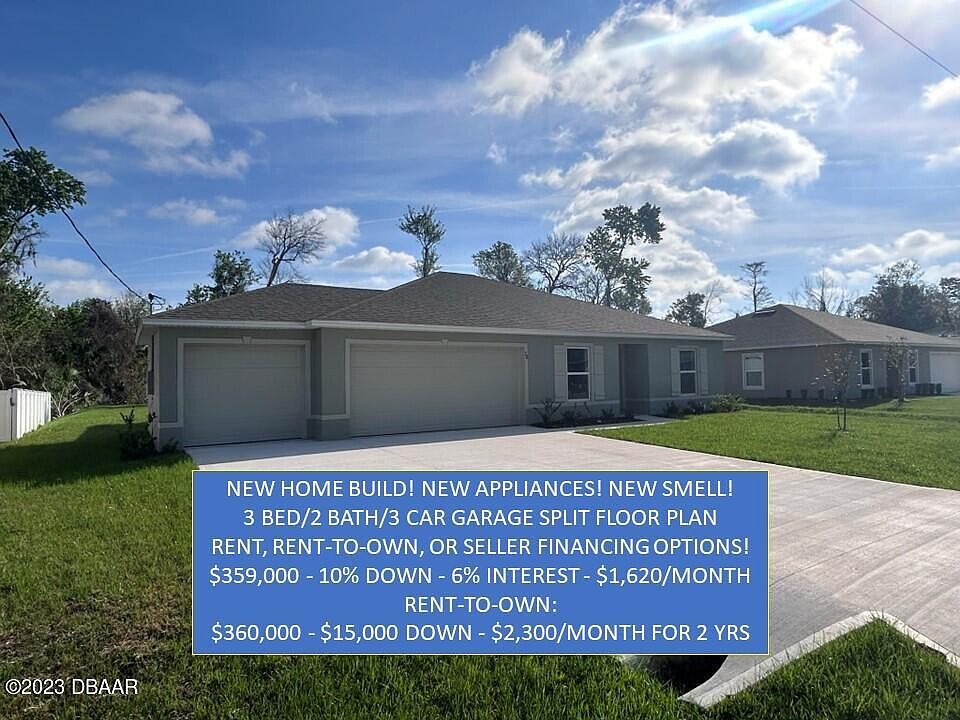 NEW HOME BUILD, NEW APPLIANCES, NEW SMELL, NEW EVERYTHING! This 3 Bed/2 Bath with 3 Car Garage Home in Palm Coast sits in the quaint neighborhood of Belle Terre. If you are looking for a split floor plan...This is the home for you! Enter the front entry way to a Family Room/Den to your right and Dining room to your left. The dining room is open to the spacious kitchen all the way to the living room with a breakfast bar. The kitchen comes fully equipped with all new Whirlpool appliances, large pantry and plenty of counter and storage space. Enter the spacious living room with a sliding glass door that leads out to the back patio area. Enjoy the large yard for entertaining during those cool spring nights and boasts enough space to put in a pool. The two spacious bedrooms are separated from the owner's suite area and share a large bathroom with tub/shower combo. The owner's suite is a large spacious area connected to the owner's bathroom with large walk-in shower, a walk-in closet, and vanity sink. Washer/Dryer hookup in the laundry room that leads to the 3-car garage. This home is located near public schools, community centers, shopping and more that Palm Coast has to offers. This home can be yours today with options such as Renting, Rent-To-Own, or even Owner Financing. Call today to learn more and enjoy your NEW future home!